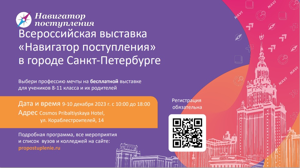 Выставка «Навигатор поступления» для учащихся 8–11 классов и их родителей состоится 9 - 10 декабря 2023 года по адресу: г. Санкт-Петербург, ул. Кораблестроителей, 14