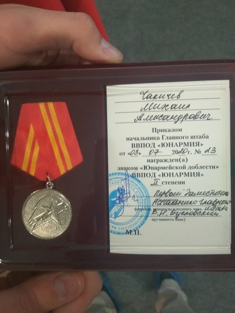 В рамках подведения итогов юнармеец Чакичев Приказом начальника Главного штаба ВВПОД "ЮНАРМИЯ" награжден знаком "Юнармейской доблести" ВВПОД "ЮНАРМИЯ" II степени.