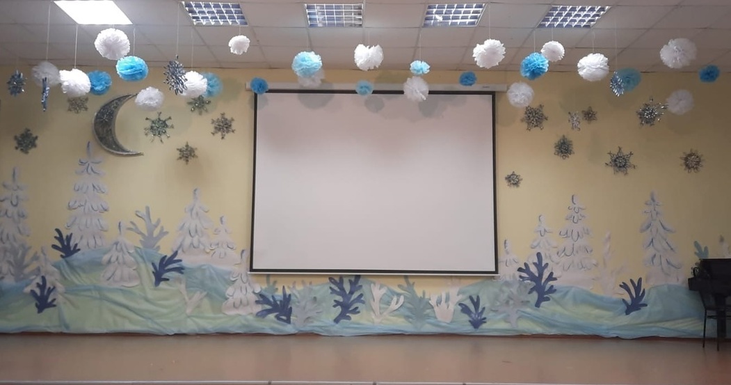 С 19 декабря оформлена новогодняя фотозона (3 этаж основного здания). Но самой интересной и трудоёмкой работой оказалось оформление новогодней сцены в актовом зале.