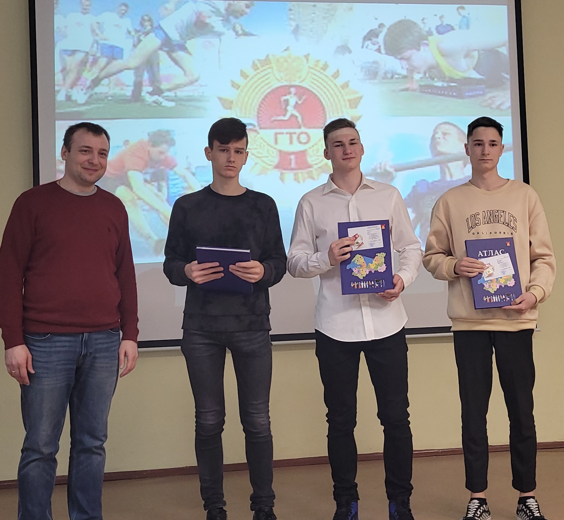 Золотыми значками ГТО были награждены Проскурня Виктор (11-а класс) и Гурин Егор (10а класс), бронзовым значком ГТО наградили Евграфова Артёма (9-д класс), руководитель Арбузова Надежда Петровна и Фомичева Татьяна Николаевна.