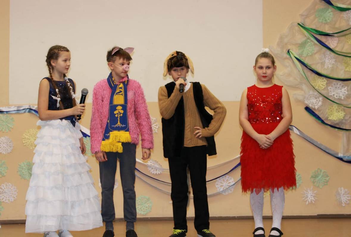 Ведущие мероприятия, Собачка - символ уходящего года, Свинка - символ Нового года, Дед Мороз и Снегурочка весело развлекали учеников школы.