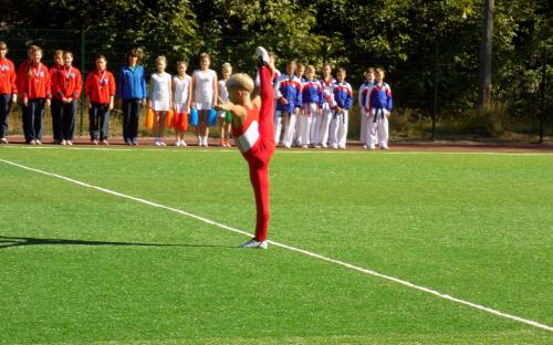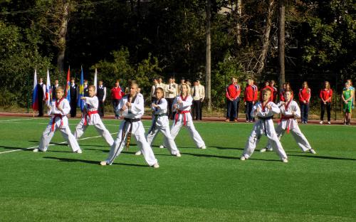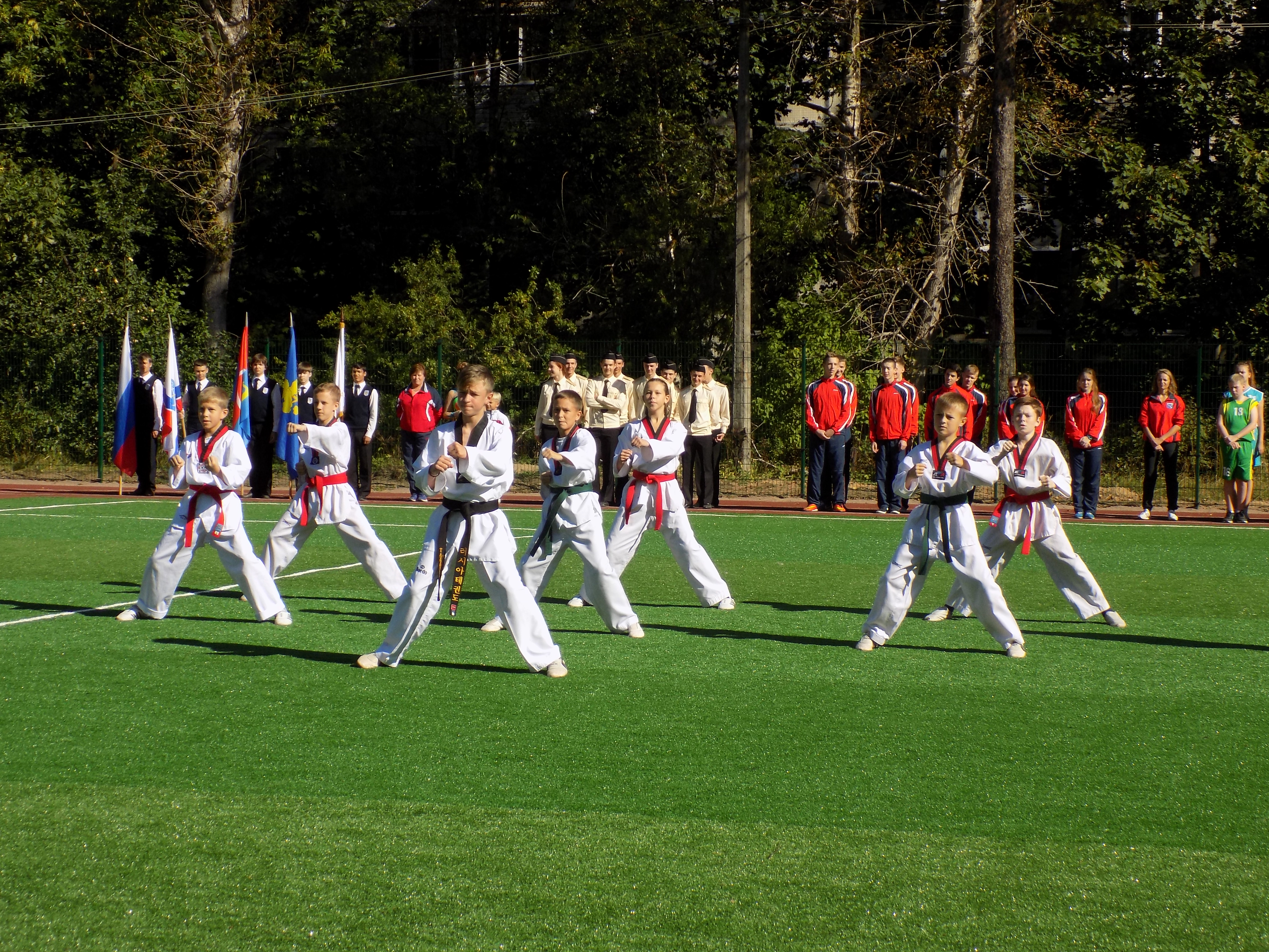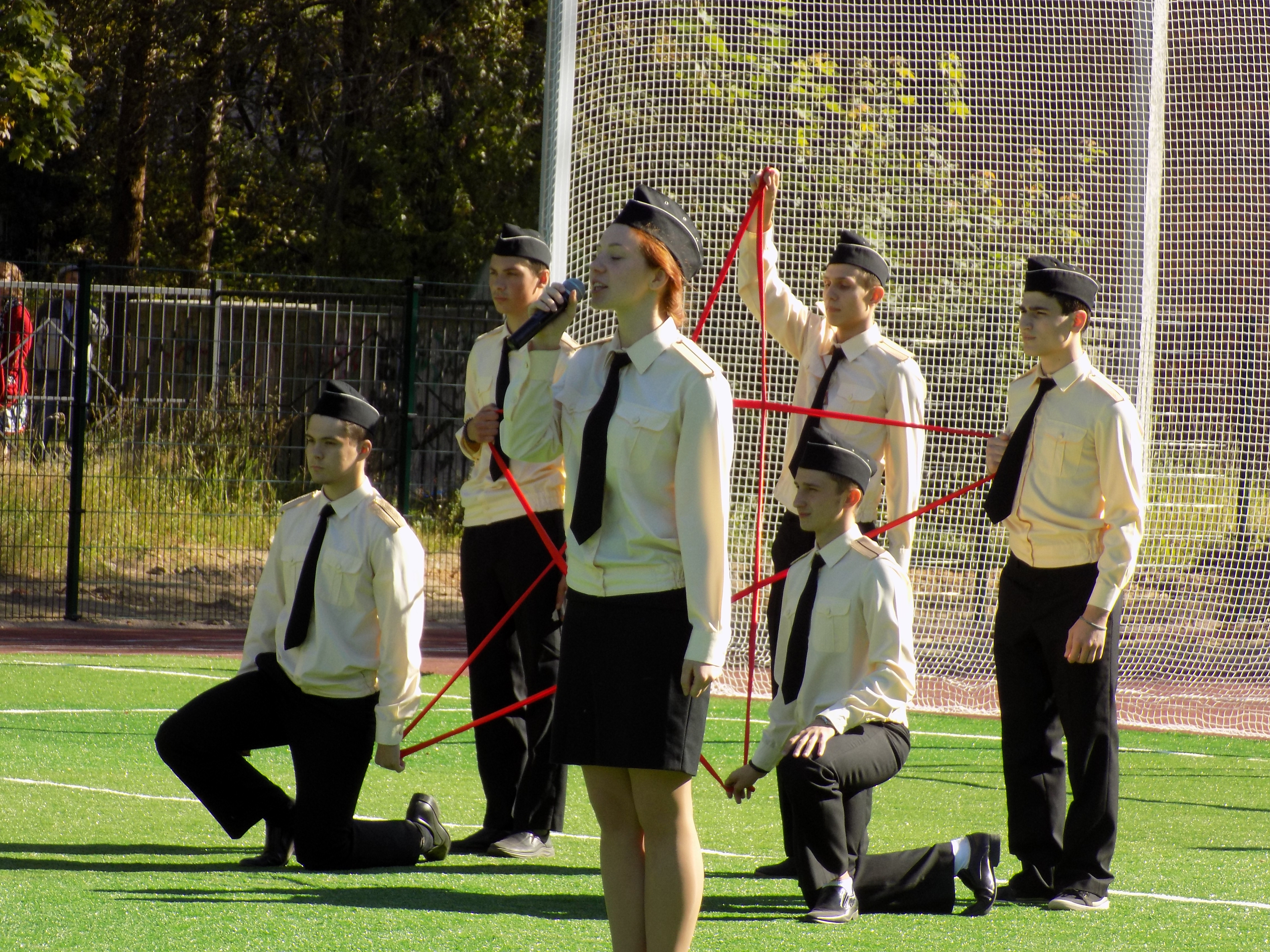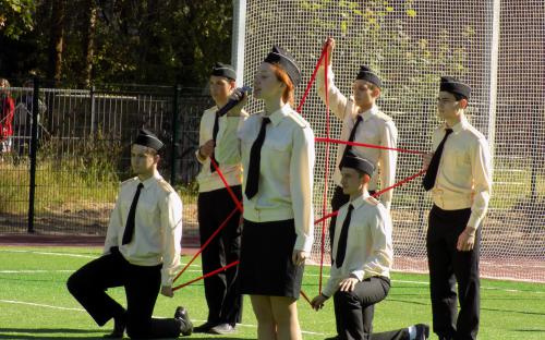 Первым из спортсменов на поле вышел Владислав Карепин - начинающая звезда спортивной легкой атлетики, который в свои достаточно юные годы уже имеет третий взрослый разряд. Казалось, его выступление все собравшиеся смотрели на одном дыхании. Не успели гости выдохнуть, как на спортивную площадку приглашается Маргарита Баланда, ученица 10 «а» класса и уже мастер спорта России по спортивной акробатике, - у всех снова перехватывает дыхание. Далее на очереди продемонстрировать свое мастерство была сборная команда по тхэквондо. Эти ребята славятся успехами в боевых искусствах, поэтому будет лишним описывать, насколько зрелищным было их выступление. Для того, чтобы привнести в спорт элементы бодрящего дух шоу, вышли на стадион веселые участники черлидинга коллектива «Квазар» (руководитель - Наталья Леонидовна Цыбина). Команды выступили, и пришло время дать спортивную клятву. От имени всех спортсменов школы ее озвучил ученик 11 «б» класса Иван Шмаров: «Мы будем участвовать во всех спортивных состязаниях, уважая и соблюдая правила, по которым они проводятся, в истинно спортивном духе во славу спорта и во имя чести своих команд. Клянусь!» Троекратное «Клянемся!» раздалось в небе над новым спортивным стадионом. Сертоловская первая школа прославилась не только достижениями в спорте, но и искренней любовью к своей малой и большой Родине. Учащиеся 11-х классов, победители оборонно-спортивной, военно-патриотической игры «Зарница Северо-Запад - 2015» вышли на стадион. «Нет войне!» и «Спасибо!» нашим отцам и дедам за Великую Победу - то, что хотели сказать ребята своим выступлением на этой церемонии. И это очень трогательно, когда молодое поколение понимает, что все хорошее, что сегодня случается с ним, неразрывно связано с героизмом и мужеством, который проявил наш народ в годы Великой Отечественной войны.