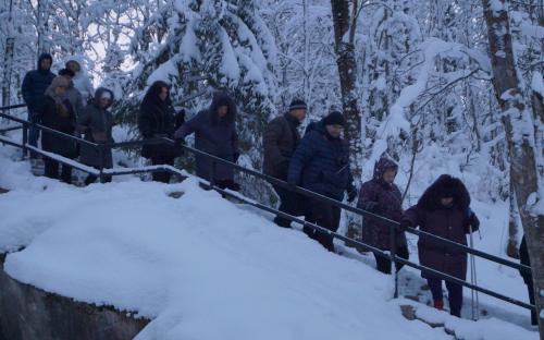 На белый снег спускалась темная ночь. Мы поспешили к водопадам на реке Тохмайоки. Не все отважились выйти на 14-тиградусный морозец из теплого автобуса, когда уже ни зги не видно. Как учительница литературы я не могла не подойти к избушке из фильма «А зори здесь тихие». Шум водопада Ахвенкоски подсказал мне направление. Мое продвижение по обрывистому берегу бурной реки было не менее экстремальным, чем девушек-зенитчиц. Так что для завершающего экстрима после школьных выпускных вечеров нам осталось вместе с дайверами погрузиться хотя бы в одно из глубоких озер и ощутить всю красоту РУСКЕАЛА и обрести кусочек кристального счастья среди мраморных скал.