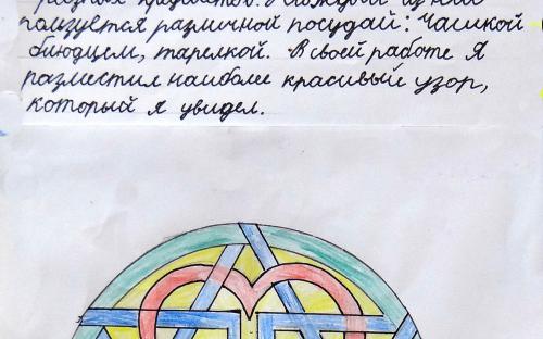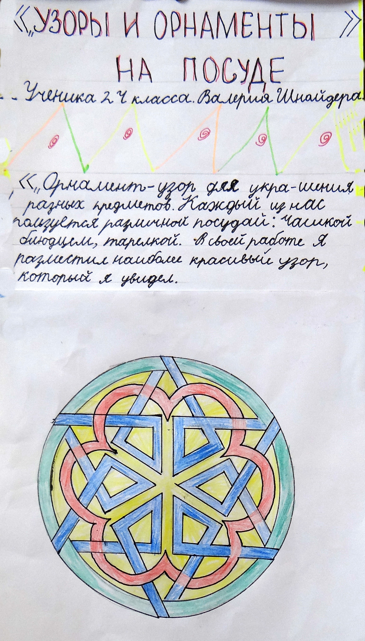 В ходе работы над проектом под руководством учителя Осиповой Л.А. дети изучили историю возникновения орнаментов, познакомились с их видами, применением в жизни. Ребята создали альбом «Узоры и орнаменты на посуде».