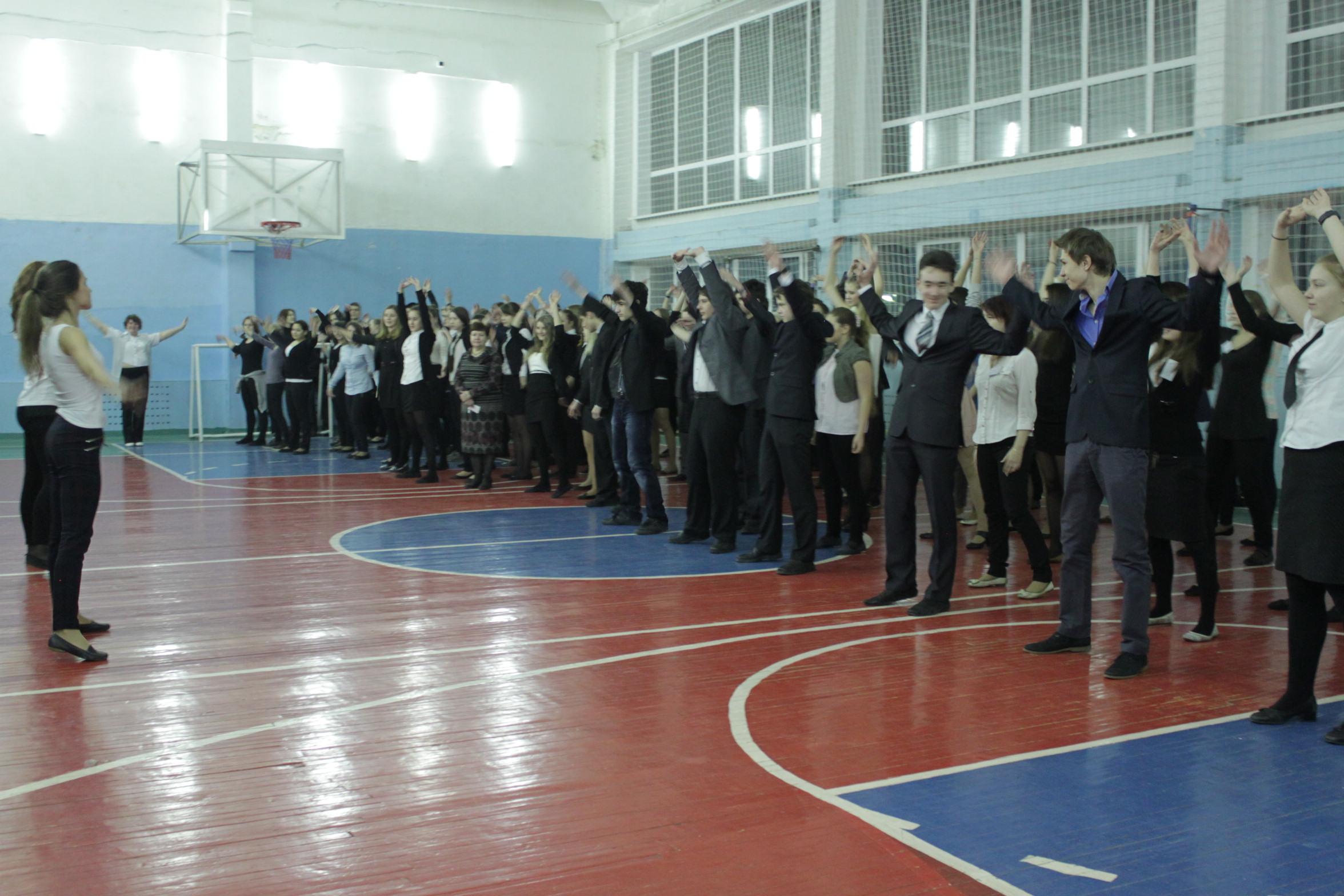 Сначала школа выполнили зарядку под предоставленную музыку с предоставленными для этого движениями (комплекс упражнений). Эта часть длилась пять минут, затем все участники произнесли девиз: «Спорт, здоровье, дружба». После этого под музыку, которую выбирала сама школа, и с движениями, разработанными школой, учащиеся выполнили вторую часть зарядки, которая длилась ещё 5 минут.