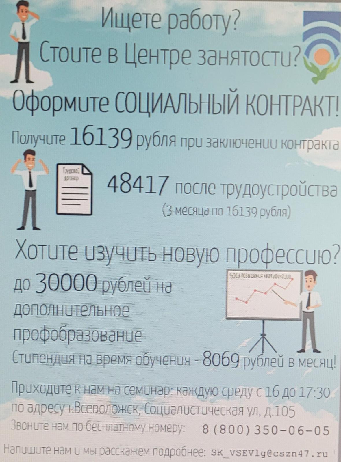 На основании письма ЛОГКУ «Центр социальной защиты населения» филиал во Всеволожском районе от 16.08.2023 №2-05-2023/1004 доводится информация о предоставлении государственной социальной помощи на основании социального контракта
