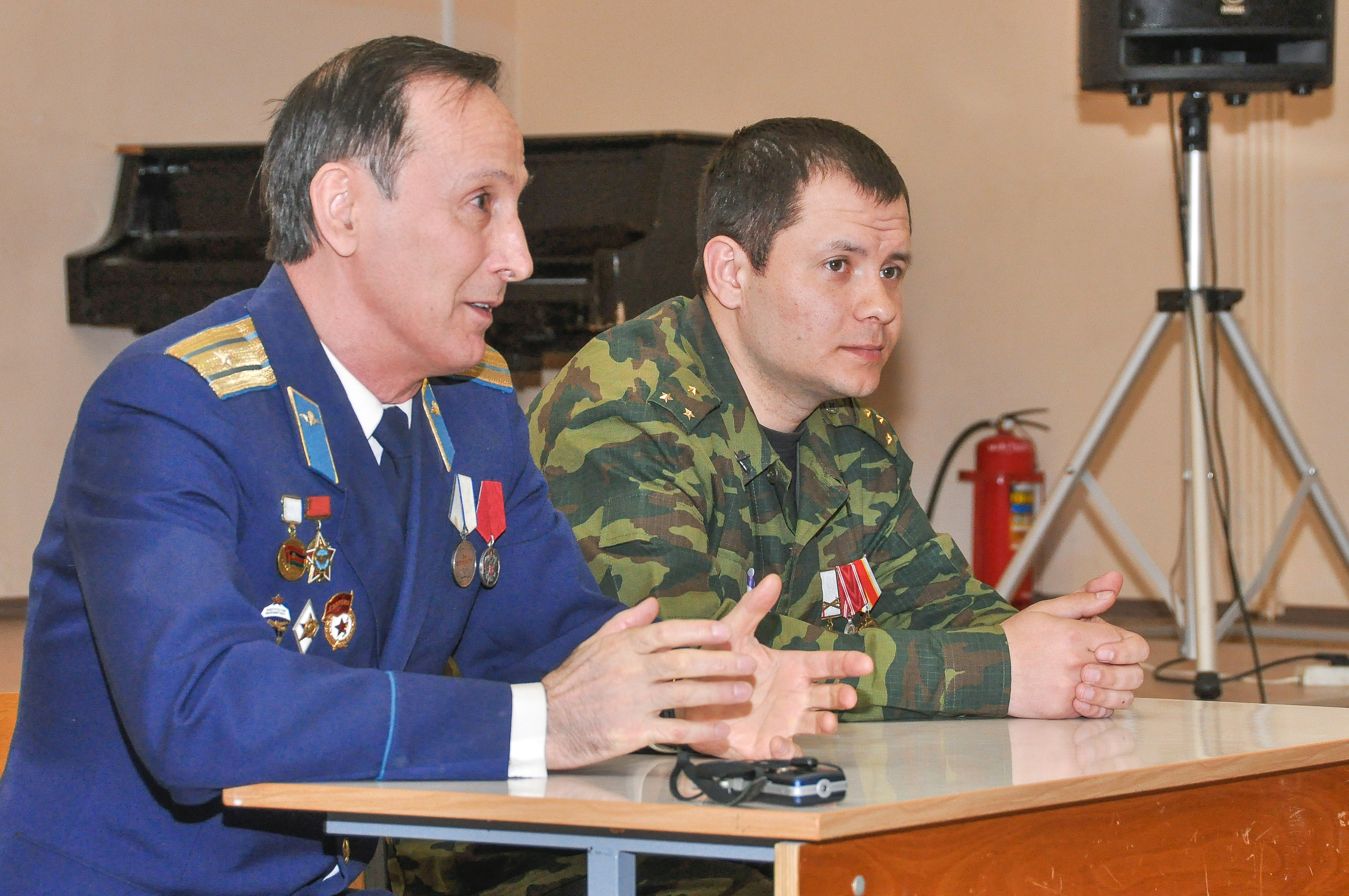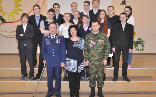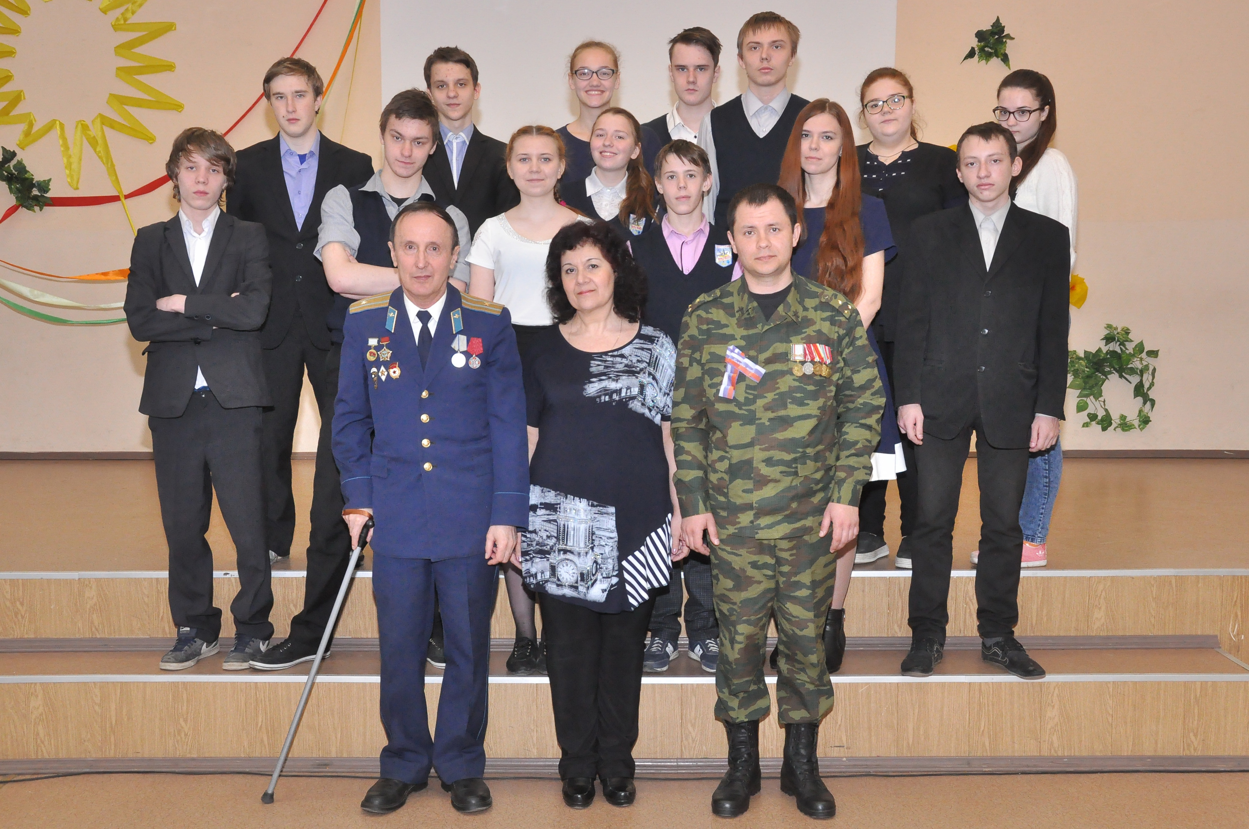 На это мероприятие были приглашены : майор запаса, выпускник десантного факультета Калининградского высшего военно - инженерного ордена Ленина Краснознамённого училища им. Жданова, ветеран Афганистана, бывший председатель сертоловского городского отделения ветеранов локальных войн и конфликтов Ленинградского регионального отделения общероссийской общественной организации " Российский Союз ветеранов Афганистана " - Рацкевич Александр Борисович, а также бывший выпускник нашей школы, участник операции по принуждению Грузии к миру - Козырев Анатолий Александрович. На встрече присутствовал специальный корреспондент газеты «Петербургский рубеж ", сын лётчика - Курганский Пётр Анатольевич. Урок мужества прошёл в очень тёплой дружеской атмосфере. Гостям было что рассказать ребятам. Затаив дыхание, они слушали рассказ Александра Борисовича Рацкевича о боевых действиях в Афганистане, о нелёгкой, но почётной службе в рядах вооружённых сил России и о многом другом. Такими же интересными были рассказы Анатолия Александровича Козырева и Петра Анатольевича Курганского.