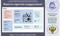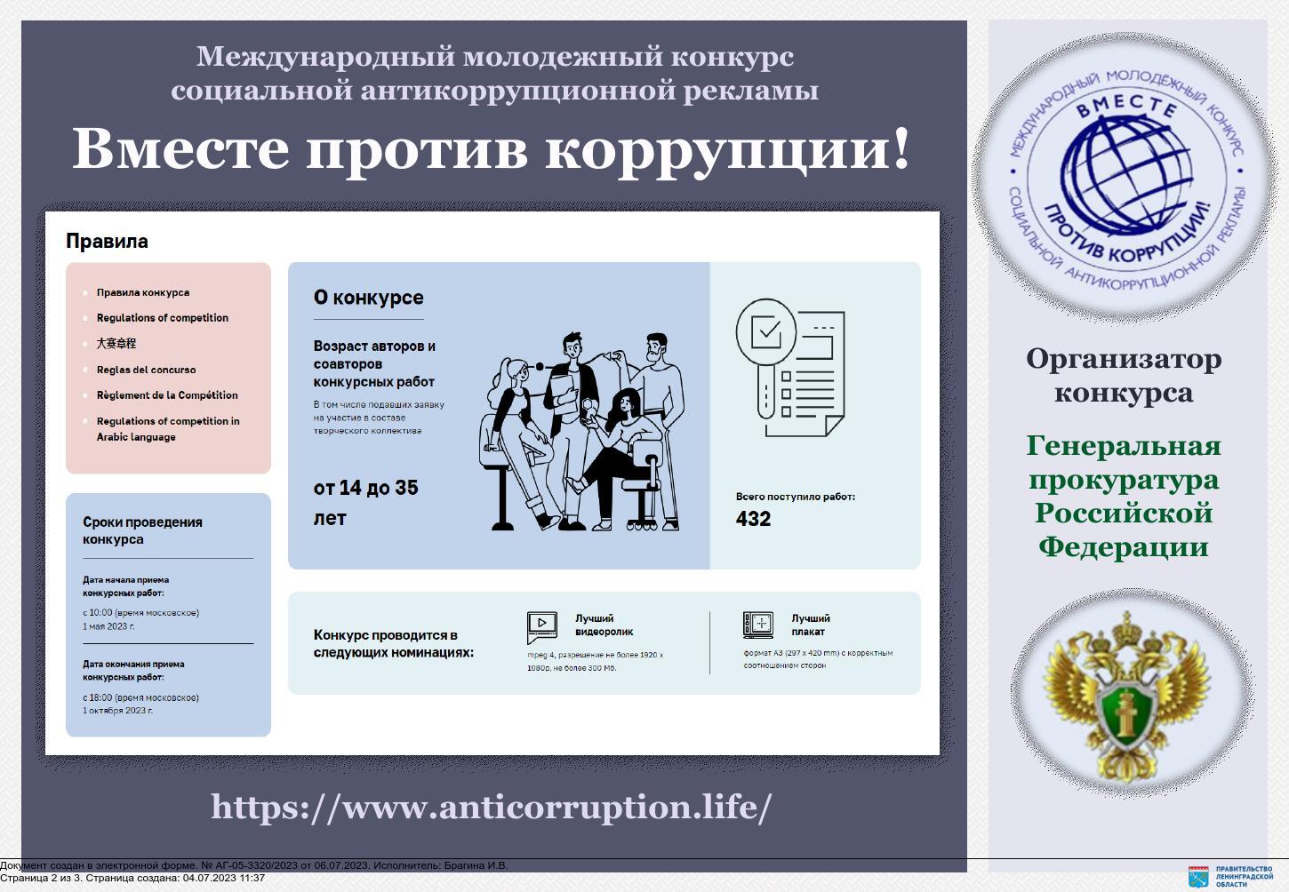 Прием конкурсных работ (антикоррупционных плакатов и видеороликов) осуществляется на сайте Конкурса www.anticorruption.life до 01.10.2023. На указанном сайте размещены Правила проведения Конкурса, которые доступны на всех официальных языках Организации Объединенных Наций. Подведение итогов Конкурса планируется приурочить к Международному дню борьбы с коррупцией. Информация о Конкурсе опубликована на Едином портале прокуратуры Российской Федерации (https://epp.genproc.gov.ru/web/gprf/mass-media/ news?item=87485150) и на сайте Исполнительного комитета Содружества Независимых Государств (https://cis.minsk.by/news/25296).